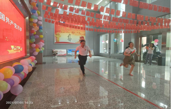 最后,在一浪高过一浪的呐喊声、欢呼声、加油声中,进行了“传承革命精神、祝福伟大的党”党旗接力赛。接力赛以工会小组为单位,每队派四男四女参加比赛,队员手持党旗国旗,依次完成投篮、跑步、跳绳、跑步等项目。比赛场上,队员们投篮精准、健步如飞、身轻如燕;更有场外的啦啦队员们,摇旗呐喊,为场上队员加油助威。顿时,大厅里党旗国旗闪耀,变成了一片欢乐的海洋。